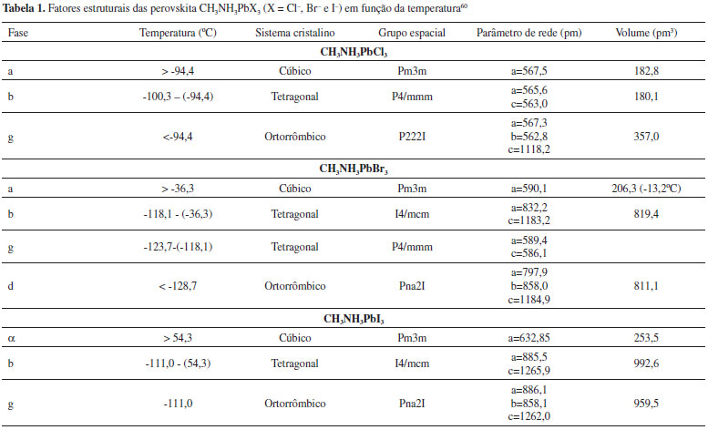 O tamanho dos íons A e B influenciam diretamente na estrutura cristalina, sendo a estabilidade cristalográfica da perovskita estimada pelo fator octaédrico µ (µ=rB/rX) e pelo fator de tolerância τ (τ=(rA+rX)/[21/2(rB+rX)]), em que rA, rB e rX são os raios iônicos de A, B e X, respectivamente.1,10,12 A estrutura cúbica ideal ocorre quando τ = 1, enquanto τ < 1 indica que o cátion A é pequeno demais e τ > 1 indica que A é grande demais para caber nas cavidades entre as unidades octaédricas BX6. Quando τ < 1, ocorre a chamada distorção octaédrica, em que o tamanho muito pequeno do cátion A resulta na diminuição da simetria do sistema. Com o intuito de manter a ligação, cada octaedro deve girar sempre que um deles mudar sua posição em torno do eixo normal da camada, podendo resultar, assim, nas chamadas inclinações out of phase (no sentido oposto da fase, quando a direção da rotação se alterna entre diferentes camadas) ou inclinações in phase (quando as rotações ocorrem na mesma direção). A distorção Jahn-Teller ocorre quando a configuração eletrônica do cátion é degenerada orbitalmente, produzindo estado de menor energia instável. Esse efeito ocorre como resultado de um declínio linear da energia, seguido de desarranjos no cristal, enquanto, ao mesmo tempo, a energia elástica do sistema aumenta. Rearranjos distorcidos podem se manifestar tanto pelo alongamento quanto pelo encolhimento das ligações octaédricas, causando uma queda da energia ao mínimo. Assim, uma série de elementos podem servir como substituintes para os materiais de perovskitas absorvedores de luz.1 A estrutura cúbica da perovskita ocorre geralmente em 0,81 < τ < 1,11 e 0,44 < µ < 0,90.1,17,53 Os valores mais baixos de τ resultam em uma estrutura menos simétrica tetragonal ou ortorrômbica.16 Tomando o CH3NH3PbX3 como exemplo, de acordo com os valores dos raios dos respectivos íons, os fatores τ calculados são 0,85, 0,84 e 0,83 e os fatores µ são 0,66, 0,61 e 0,54, para X = Cl-, Br- e I-, respectivamente. Desta forma, espera-se que perovskitas de haletos de metilamônio de chumbo apresentem estrutura cúbica. Apesar dessas limitações, transições de fases de CH3NH3PbX3 ocorrem com a variação da temperatura, de tal forma que em temperaturas mais baixas ocorre a fase ortorrômbica, que se transforma em tetragonal e depois em fase cúbica à medida que se aumenta a temperatura.59 À temperatura ambiente, as perovskitas com íons Cl- e Br- são cúbicas, enquanto que aquela com íons I- é tetragonal, como mostrado na Tabela 1, que lista os fatores estruturais em função da temperatura.