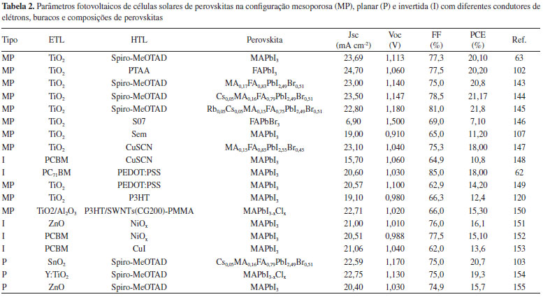 REFERÊNCIAS 1. Wang, B.; Xiao, X.; Chen, T.; Nanoscale 2014, 6, 12287. 2. Armaroli, N.; Balzani, V.; Angew. Chem. Int. Ed. 2006, 45, 2. 3. Longo, C.; Paoli, Marco-A. D.; J. Braz. Chem. Soc. 2003, 14, 889. 4. Rhodes, C. J.; Sci Prog. 2010, 93, 37. 5. Rühle, S.; Shalom, M.; Zaban, A.; ChemPhysChem 2010, 11, 2290. 6. Carvalho, E. F. A.; Calvete, M. J. F.; Rev. Virtual Quim. 2010, 2, 192. 7. Machado, C. T.; Miranda, F. S.; Rev. Virtual Quim. 2015, 7, 126. 8. Jean, J.; Brown, P. R.; Jaff, R. L.; Buonassisid, T.; Bulović, V.; Energy Environ. Sci. 2015, 8, 1200. 9. Green, M. A.; Progress in Photovoltaics: Research and Applications 2005, 13, 447. 10. Polman, A., Knight, M., Garnett, E. C., Ehrler, B., Sinke, W. C.; Science 2016, 352, 307. 11. Park, N.-G.; J. Phys. Chem. Lett. 2013, 4, 2423. 12. Snaith, H. J.; J. Phys. Chem. Lett. 2013, 4, 3623. 13. Kim, H.-S.; Im, S. H., Park, N.-G.; J. Phys. Chem. C 2014, 118, 5615. 14. Hodes, G.; Cahen, D.; Nature Photon 2014, 8, 87. 15. Service, R. F.; Science 2014, 344, 458. 16. Green, M. A.; Ho-Baillie, A.; Snaith, H. J.; Nat. Photonics 2014, 8, 506. 17. Petrović, M.; Chellappan, V.; Ramakrishna, S.; Solar Energy 2015, 122, 678. 18. Green, M. A.; Emery, K.; Hishikawa, Y.; Warta, W.; Dunlop, E. D.; Progress in Photovoltaics: Research and Applications 2014, 22, 701. 19. www.nrel.gov, acessada em setembro de 2017. 20. Fraas, L.; Partain, L.; Solar Cells: A Brief History and Introduction in Solar Cells and their applications; Fraas, L., Partain, L., eds.; John Wiley & Sons, Inc.: Singapore, 2010, cap. 1. 21. Ohnishi, M.; Takeoka, A.; Nakano, S.; Kuwano, Y.; Renewable Energy 1995, 6, 275. 22. O'regan, B.; Gratzel, M.; Nature 1991, 353, 737. 23. Yu, M.; Long, Yun-Ze.; Sun, B.; Fan, Z.; Nanoscale 2012, 4, 2783. 24. Agnaldo, J. S.; Bastos, J. B. V.; Cressoni, J. C.; Viswanathan, G. M.; Rev. Bras. Ens. Fís. 2006, 28, 77. 25. Kakiage, K.; Aoyama, Y.; Yano, T.; Oya, K.; Fujisawa, J.; Hanaya, M.; Chem. Commun. 2015, 51, 15894. 26. Kuang, D.; Brillet, J.; Chen, P.; Takata, M.; Uchida, S.; Miura, H.; Sumioka, K.; Zakeeruddin, S. M.; Grätzel, M.; ACS Nano 2008, 2, 1113. 27. Lee, J.-K.; Yang, M.; Mater Sci Eng B 2011, 176, 1142. 28. Halme, J.; Vahermaa, P.; Miettunen, K.; Lund, P.; Adv. Mater. 2010, 22, E210. 29. Sugathan, V.; John, E.; Sudhakar, K.; Renewable Sustainable Energy Rev. 2015, 52, 54. 30. Shalini, S.; Balasundaraprabhu, R.; Prasanna, S.; Mallick, T. K.; Senthilarasu, S.; Renewable Sustainable Energy Rev. 2015, 51, 1306. 31. Tian, J.; Cao, G.; Nano Reviews 2013, 4, 22578. 32. Kouhnavard, M.; Ikeda, S.; Ludin, N. A.; Ahmad Khairudin, N. B.; Ghaffari, B. V.; Mat-Terid, M. A.; Ibrahim, M. A.; Sepeai, S.; Sopian, K.; Renewable Sustainable Energy Rev. 2014, 37, 397. 33. Lee, J.-W.; Son, D.-Y.; Ahn, T. K.; Shin, H.-W.; Kim, I. Y.; Hwang, S.-J.; Ko, M. J.; Sul, S.; Han, H.; Park, N.-Gyu.; Scientific Reports, 2013, 3, 1050. 34. Hod, I.; Zaban, A.; Langmuir 2014, 30, 7264. 35. Kazim, S.; Nazeeruddin, M. K.; Gratzel, M.; Ahmad, S.; Angew. Chem., Int. Ed. 2014, 53, 2812. 36. Sum, T. C.; Mathews, N.; Energy Environ. Sci. 2014, 7, 2518. 37. Park, N.-G.; Materials Today 2015, 18, 65. 38. Song, T.-B.; Chen, Q.; Zhou, H.; Jiang, C.; Wang, H.-H.; Yang, Y. M.; Liu, Y.; You, J.; Yang, Y.; J. Mater. Chem. A 2015, 3, 9032. 39. De Wolf, S.; Holovsky, J.; Moon, S. J.; Löper, P.; Niesen, B.; Ledinsky, M.; Haug, F. J.; Yum, J. H.; Ballif, C.; J. Phys. Chem. Lett. 2014, 5, 1035. 40. Noh, J. H.; Im, S. H.; Heo, J. H.; Mandal, T. N. Seok, S. I.; Nano Lett. 2013, 13, 1764. 41. Ishihara, T.; Optical Properties of Pb-based inorganic-organic perovskites, World Scientific: Singapore, 1995, pp. xix, 414 p. 42. Lee, M. M.; Teuscher, J.; Miyasaka, T.; Murakami, T. N.; Snaith, H. J.; Science 2012, 338, 643. 43. Etgar, L.; Gao, P.; Xue, Z.; Peng, Q.; Chandiran, A. K.; Liu, B.; J. Am. Chem. Soc., 2012, 134, 17396. 44. Ponseca, C. S.; Savenije, T. J.; Abdellah, M.; Zheng, K.; Yartsev, A.; Pascher, T.; Harlang, T.; Chabera, P.; Pullerits, T.; Stepanov, A.; Wolf, J. P.; Sundström, V.; J. Am. Chem. Soc. 2014, 136, 5189. 45. Stranks, S. D.; Eperon, G. E.; Grancini, G.; Menelaou, C.; Alcocer, M. J. P.; Leijtens, T.; Herz Petrozza, L. M. A.; Snaith, H. J.; Science 2013, 342, 341. 46. Xing, G.; Mathews, N.; Sun, S.; Lim, S. S.; Lam, Y. M.; Gratzel, M.; Mhaisalkar, S.; Sum, T. C.; Science 2013, 342, 344. 47. Shi, D.; Adinolfi, V.; Comin, R.; Yuan, M.; Alarousu, E.; Buin, A.; Chen, Y.; Hoogland, S.; Rothenberger, A.; Katsiev, K.; Losovyj, Y.; Zhang, X.; Dowben, P. A.; Mohammed, O. F.; Sargent, E. H.; Bakr, O. M.; Science 2015, 347, 519. 48. Jiang, M.; Wu, J.; Lan, F.; Tao, Q.; Gao, D.; Li, G.; J. Mater. Chem. A 2015, 3, 963. 49. Lv, S.; Han, L.; Xiao, J.; Zhu, L.; Shi, J.; Wei, H.; Xu, Y.; Dong, J.; Xu, X.; Li, D.; Wang, S.; Luo, Y.; Meng, Q.; Li, X.; Chem. Commun. 2014, 50, 6931. 50. Ball, J. M.; Lee, M. M.; Hey, A.; Snaith, H. J.; Energy Environ.Sci. 2013, 6, 1739. 51. Marchioro, A.; Teuscher, J.; Friedrich, D.; Kunst, M.; van de Krol, R.; Moehl, T.; Gratzel, M.; Moser, J.-E.; Nat. Photonics 2014, 8, 250. 52. Jeng, J.- Y.; Chiang, Y.-F.; Lee, M.-H.; Peng, S.-R.; Guo, T.-F.; Chen, P.; Wen, T.-C.; Adv. Mater. 2013, 25, 3727. 53. Giorgi, G.; Yamashita, K.; J. Mater. Chem. A 2015, 3, 8981. 54. King, G., Woodward, P. M.; J. Mater. Chem. 2010, 20, 578 55. Schlom, D. G.; Chen, L.-Q.; Pan, X.; Schmehl, A.; Zurbuchen, M. A.; J. Am. Ceram. Soc. 2008, 91, 2429. 56. Müller, K. A.; Kool, T. W.; Properties of perovskites and other oxides, World Scientific: Singapore, 2010. 57. Shriver, D. F.; Atkins, P. W.; Overton, T. L.; Rourke, J. P.; Weller, M. T.; Armstrong, F. A.; Química Inorgânica, 4. ed., Bookman: Porto Alegre, 2008. 58. Giorgi, G.; Fujisawa, J.-I.; Segawa, H.; Yamashita, K.; J. Phys. Chem. Lett. 2013, 4, 4213. 59. Liu, X.; Zhao, W.; Cui, H.; Xie, Y.; Wang, Y.; Xu, T.; Huang, F.; Inorg. Chem. Front. 2015, 2, 315. 60. Poglitsch, A.; Weber, D.; J. Chem. Phys. 1987, 87, 6373. 61. Shao, U.; Yuan, Y.; Huan