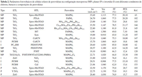 Os últimos anos trouxeram uma rápida, e sem precedentes, ascensão de uma nova classe de células solares, dentro das células de terceira geração, baseadas em perovskitas.11-18 Atualmente, a aplicação desses materiais em dispositivos fotovoltaicos tem se tornado objeto de estudo de vários grupos de pesquisa, apresentando considerável evolução na arquitetura das células solares, bem como no valor de eficiência de conversão (PCE, do inglês Power Conversion Efficiency), a qual atualmente é certificada com valor de 22,1%, de acordo com o Laboratório Nacional de Energia Renovável (NREL) dos Estados Unidos.19