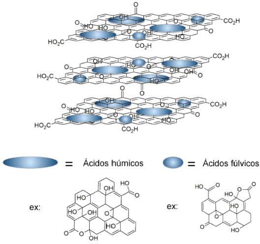 Em 2011 Rourke et al. propuseram que a estrutura de OG era composta de folhas de grafeno pouco oxidadas, porém, com fragmentos de grafeno altamente oxidados, chamados "oxidative debris" (OD), aderidos a elas, de forma que os ODs têm atuação semelhante à de surfactantes, aumentando a solubilidade do composto como um todo.14 Posteriormente Dimiev et al. sugeriram que esses ODs são constituídos de estruturas similares a ácidos húmicos e fúlvicos, que diferem entre si através do peso molecular, número de grupos funcionais e solubilidade.15 Com base nos trabalhos de Rourke e Dimiev, novos estudos propuseram que 1/3 da composição de OG é de folhas de grafeno oxidadas contendo grupos hidroxila e epóxidos no interior do plano basal e carboxilas e lactois nas extremidades do plano. Os 2/3 restantes são referentes a ODs envoltos por moléculas de água e aderidos às folhas de óxido de grafeno, como ilustrado na Figura 2.