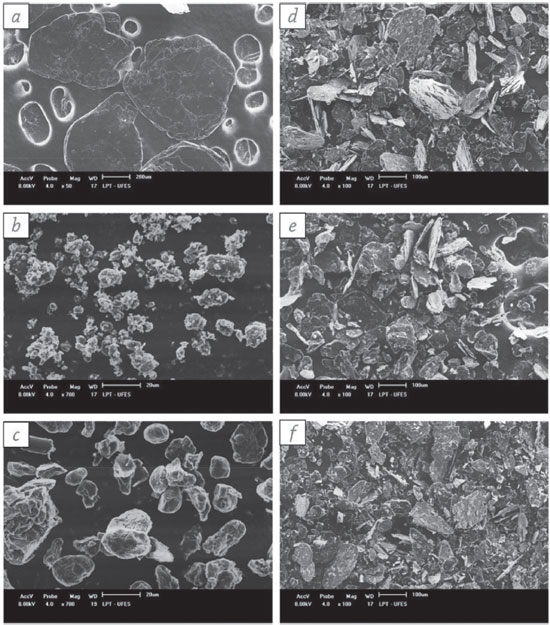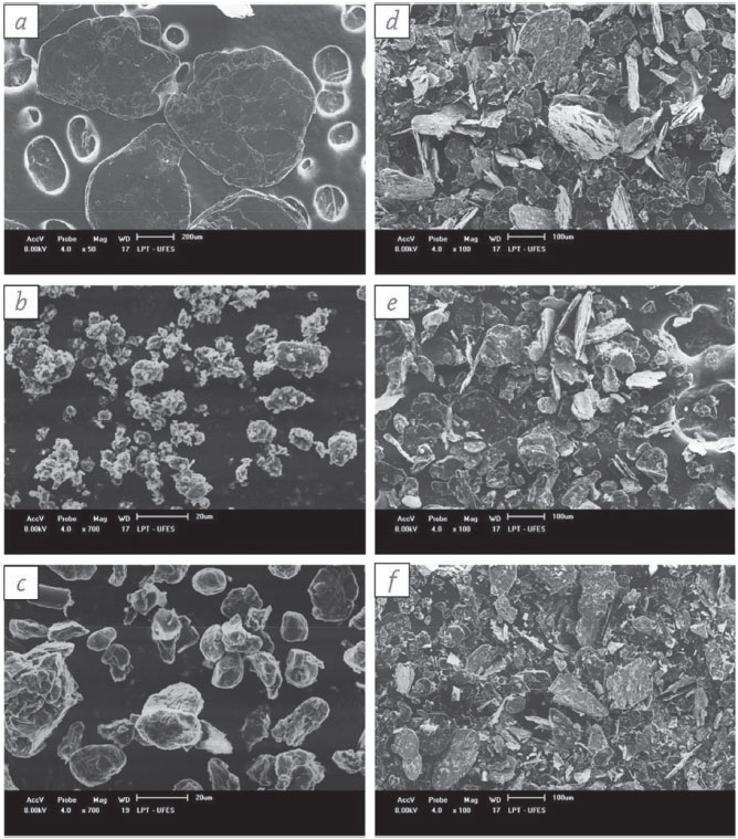 Figura 3. Imagens de MEV dos grafites precursores: (a) GF, (b) GM30, (c) GB, (d) GMax, (e) GN e (f) GL