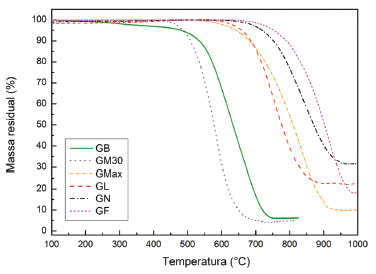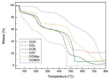 ![]() Figura 7. Curvas de TG dos óxidos de grafite, sob atmosfera oxidante