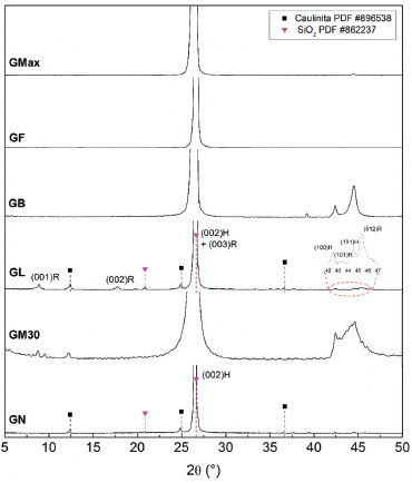 A Figura 5 mostra os difratogramas de raios X obtidos para os grafites precursores, em que se observa como dominante o pico em aproximadamente 26°. Esse pico é característico da estrutura hexagonal do grafite, correspondendo à reflexão de planos (002), e se apresenta mais estreito nas amostras GF, GN e GL, o que indica que esses grafites apresentam maior cristalinidade em comparação aos demais estudados, corroborando com os resultados observados pelas TGs.9 Existem, ainda, picos em aproximadamente 43 e 44,5° que correspondem às reflexões (100) e (101) do grafite hexagonal, respectivamente.25X-ray diffraction patterns of hexagonal graphite (h-graphite É possível perceber também que GN e GL apresentam impurezas, identificadas como SiO2 e caulinita segundo as fichas PDF #862237 e #896538, respectivamente,26 o que é consistente com a observação de um elevado teor de cinzas nas curvas de TG obtidas para esses precursores.