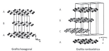 ![]() Figura 6. Sequência de empilhamento dos planos nas fases hexagonal e romboédrica do grafite. (Adaptado da referência 28, com autorização da Elsevier)