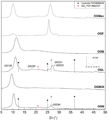 Os resultados de DRX obtidos para os óxidos produzidos, exibidos na Figura 8, demonstram com clareza a eficiência da reação de oxidação, indicando nitidamente a formação da estrutura esperada para óxidos de grafite. A análise dos difratogramas de raios X dos OGs permitiu verificar o aparecimento de um pico de difração intenso em 2θ ≅ 11° para todas as amostras, exceto OGF, o que é um indicativo da formação da estrutura de óxido de grafite. O surgimento deste pico e sua posição em baixo ângulo implicam em um aumento da distância interplanar entre um plano A e um plano B do grafite, correspondendo a aproximadamente 7-8 Å nos óxidos, o que está associado com a presença de grupos funcionais oxigenados e moléculas de água intercaladas entre os planos basais.8,29-31 Os difratogramas de raios X das amostras OGM30 e OGB são típicos da estrutura de um OG com elevado grau de oxidação, por não apresentarem outros picos significativos além do pico em torno de 11°.30 Por outro lado, os difratogramas de raios X de OGN, OGL, OGF e OGMax apresentam ainda contribuição do pico (002) da estrutura do grafite (2θ ≅ 26°), o que indica que essas amostras exibem em sua composição regiões grafíticas residuais com distância interplanar pouco alterada em comparação com o grafite.32 Isso evidencia que a fase grafítica não foi completamente transformada pela oxidação nessas amostras, como também sugerido pelos resultados de TG. Ademais, outro aspecto notável é a permanência dos picos de difração referentes à fase romboédrica do grafite para a amostra OGL, indicando que essa fase não foi eficientemente consumida durante o processo de oxidação empregado. Esses resultados sugerem que em todos os casos houve oxidação do grafite, porém esta não ocorreu de maneira eficaz e homogênea em alguns precusores - OGF e OGMax, principalmente. Esta comparação pode ser vista mais claramente quando se analisam os difratogramas de raios X dos produtos OGM30 e OGB, que não indicam resquícios de estrutura grafítica ou de impurezas, sugerindo um processo de oxidação mais homogêneo nesses dois materiais. Os picos devidos aos compostos SiO2 e caulinita que aparecem para OGL e OGN confirmam a presença de impurezas também sugeridas pelos percentuais em massa de cinzas em suas curvas de TG, assim como pelos difratogramas de raios X e curvas de TG de seus precursores. É válido ressaltar que a posição do principal pico de difração de SiO2 (2θ ≅ 26°) coincide com os picos das reflexões (002) do grafite hexagonal e (003) do grafite romboédrico.26-28