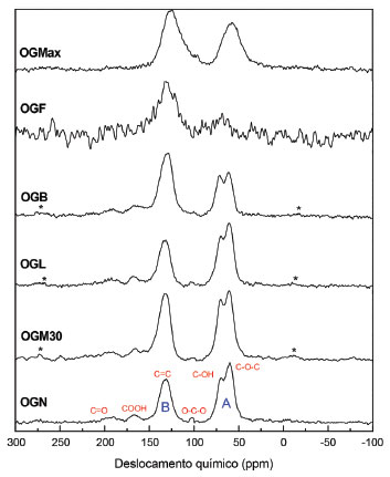 A espectroscopia de RMN de 13C no estado sólido é uma técnica eficiente para estudar a estrutura química de óxidos de grafite. Um espectro típico de RMN de 13C no estado sólido de uma amostra de OG com bom grau de oxidação (como o espectro obtido para a amostra OGN, mostrado na Figura 9) apresenta picos intensos em 60 e 69 ppm (região A) relacionados a átomos de carbono ligados a hidroxilas e de epóxidos, respectivamente; em 100 ppm (pouco intenso) referente a lactois; um pico intenso em 129 ppm, associado às duplas ligações C=C nos planos aromáticos (região B); e em 165 e 191 ppm (pouco intensos também) relativos a grupos carbonila de ésteres (ou ácidos carboxílicos) e cetonas, respectivamente.11,12,33,34 É importante ressaltar que em uma amostra heterogênea como alguns dos óxidos aqui investigados (com regiões grafíticas residuais não oxidadas misturadas a regiões ricas em óxido de grafeno), os espectros de RMN de 13C mostram preferencialmente as regiões não grafíticas, porque as regiões grafíticas devem dar origem a picos muito alargados, com baixa relação sinal/ruído, difíceis de serem observados em comparação com as regiões tipicamente observadas em um espectro de RMN de 13C de OG.9 Isso ocorre devido à deslocalização de elétrons nessas regiões grafíticas e consequente alta suscetibilidade diamagnética que leva a um alargamento anisotrópico.35