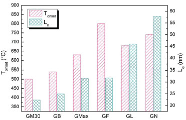 ![]() Figura 10. Gráfico comparativo dos valores de Lc e temperatura inicial de oxidação (Tonset) dos grafites estudados