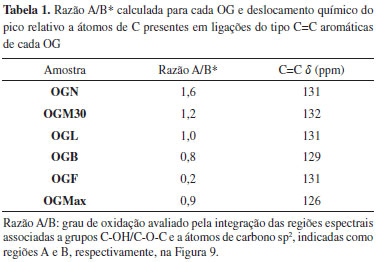 É importante observar que a presença dos grupos funcionais oxigenados típicos da estrutura de OGs é claramente constatada nos espetros dos óxidos OGN, OGM30, OGL e OGB. No caso de OGMax, apenas um sinal alargado é observado na região espectral que corresponde a C-O-C de epóxidos e grupos C-OH de hidroxilas, além de outro sinal igualmente largo devido a carbonos sp 2; já para OGF, a relação sinal/ruído obtida é muito pobre, apenas com sinais fracos detectados nas mesmas regiões espectrais mencionadas. O grau de oxidação (razão A/B) de cada material foi avaliado pela integração das regiões espectrais associadas a grupos C-OH/C-O-C e a átomos de carbono sp 2, indicadas como regiões A e B, respectivamente na Figura 9;36 os valores das razões calculadas estão listados na Tabela 1.