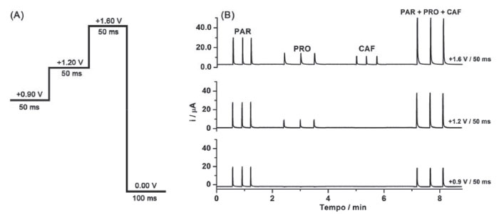 Figura 2. (A) Esquema de aplicação de pulsos de potencial; (B) Amperogramas obtidos após injeções de soluções contendo somente PAR (30 mg L-1), somente PRO (18 mg L-1), somente CAF (6 mg L-1) e PAR + PRO + CAF (30 + 18 + 6 mg L-1, respectivamente). Velocidade de agitação da solução no interior da célula: 1400 rpm; volume de injeção: 150 µL; velocidade de injeção: 100 µL s-1