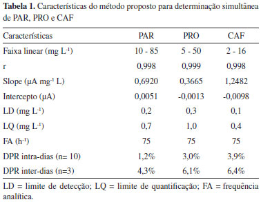 As curvas de calibração obtidas a partir de dados da Figura 4A para PAR, PRO e CAF apresentaram linearidade satisfatória nas faixas de concentrações estudadas (r ≥ 0,998). A Tabela 1 mostra as características analíticas do método proposto.