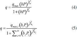 Medições de biogás no aterro O equipamento GEM 5000 da Landtech® possui uma zona de entrada (inlet) e uma zona de saída (outlet). Ao ser ligado, o GEM aciona uma bomba de sucção na zona de entrada e, assim, aduz o gás de aterro para medição. Cada cartucho com zeólitas, devidamente preparado, foi conectado à zona de saída do GEM. Antes de passar pelo inlet, o biogás atravessa um filtro em formato de disco com porosidade de 0,2 mm (Midisart®). Em seguida, o biogás filtrado é sugado pelo GEM e lançado pelo outlet. Nesta saída, uma mangueira é conectada a uma extremidade de um cartucho. A pressão do outlet força o biogás a passar pelo cartucho e, assim, facilitando o contato do biogás com a zeólita. Os valores de captação do CO2 pelo GEM ocorreram em tempo real. As condições de operação foram de 1 bar e 40 ºC. As medições foram realizadas em três drenos do Aterro Sanitário Metropolitano Oeste de Caucaia - CE (ASMOC). Para cada medição, foi empregado um tempo de 20 min, independente da massa de zeólita utilizada. Para isto, na medição realizada no dreno 1, o cartucho de 100 mg foi conectado à mangueira de entrada do GEM 5000. Ao ligá-lo, com auxílio de uma bomba de sucção, o gás é sugado para interior do equipamento onde são feitas as medições, porém, antes passando pela zeólita, na forma de pellets confinados no cartucho. Nos drenos 2 e 3, adotou-se a mesma condição. Ao fim do uso dos cartuchos com 100 mg de zeólitas 4A, empregaram-se os cartuchos com massas de 200 mg e, ao fim desse ciclo, com massas de 400 mg. Modelo de equilíbrio O modelo mais utilizado para representar a adsorção em monocamada é o modelo clássico de Langmuir (Equação 2), que normalmente representa bem as isotermas do tipo I. Esse modelo pressupõe a existência de um número bem definido e localizado de sítios de adsorção, todos energeticamente equivalentes, em que apenas uma molécula é adsorvida por sítio, sem qualquer interação com moléculas adsorvidas em sítios de adsorção vizinhos.16 O modelo de Langmuir permite uma extensão direta para descrever a adsorção multicomponente - Langmuir Estendido - (Equação 3). A seguir são apresentadas as equações de Langmuir e Langmuir estendido, respectivamente: Langmuir ![]() Em que q é a quantidade da espécie adsorvida a uma determinada pressão parcial, qm é a quantidade máxima adsorvida da espécie em adsorção, b é a força de interação entre o adsorvente e o adsorbato e P é a pressão parcial do componente em adsorção: Langmuir Estendido ![]() Em que qm,i é o valor da quantidade máxima adsorvida da espécie i; bi é relacionado com a afinidade da espécie i pelo adsorbente; Pi e é a pressão parcial do componente i na mistura. O modelo de Sips foi proposto por Sips em 1948 para resolver um problema do aumento contínuo da capacidade de adsorção com o aumento da pressão, sendo uma combinação dos modelos de Langmuir e de Freundlich.16,1 O modelo prevê o comportamento heterogêneo da energia na superfície do adsorvente, representada pelo parâmetro n. Quando a superfície do adsorvente é considerada homogênea, o modelo de Sips se reduz a Langmuir. As Equações 4 e 5 demonstram o modelo de Sips e sua versão estendida, respectivamente. ![]() ni apresenta os efeitos da heterogeneidade energética. A seletividade CO2/CH4 foi determinada a partir da quantidade molar obtida através dos modelos de ajustes de Langmuir e Sips Estendido (Equação 6). Também foi calculada a partir dos dados experimentais das isotermas monocomponete de CO2 e CH4. ![]() Sendo qCO2 e qCH2 as quantidades molares de cada gás, e yCO2 e yCH4 as frações molares dos gases na mistura.