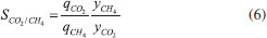 A isoterma da mistura com uma composição de 50% CO2 e 50% CH4 (v/v) (Figura 5), junto com a predição dos modelos estendidos de Langmuir e Sips, indica que os dados experimentais são melhor estimados pelo modelo de equilíbrio de Sips estendido no cenário proposto, levando-nos a poder calcular a seletividade em termos de mol CO2/mol CH4. A seletividade calculada a partir do modelo de Sips estendido decresceu de 73 mol para 30 mol de CO2/mol CH4 enquanto a seletividade teórica encontrada com base nas quantidades adsorvidas de gases diferentes para a mesma pressão de equilíbrio decresceu de 16 mol de CO2/mol CH4 para 2,3 mol de CO2/mol de CH4 na faixa de pressões estudada. A maior seletividade do CO2/CH4 na mistura em relação à seletividade teórica a partir das isotermas monocomponetes é um indicativo de que o material é fortemente seletivo para o CO2.