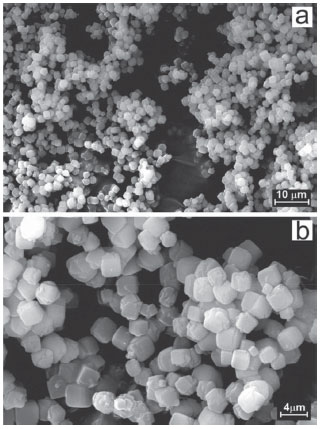 ![]() Figura 3. Micrografias (MEV) da zeólita 4A com diferentes magnificações: (a) visão geral mostrando a monodispersividade dos cristais e (b) melhor detalhamento