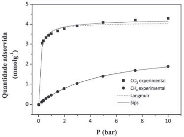 ![]() Figura 4. Isotermas de adsorção de CO2 e CH4 a 40 ºC. Também são mostrados os ajustes das isotermas experimentais aos modelos de equilíbrio de Langmuir e Sips