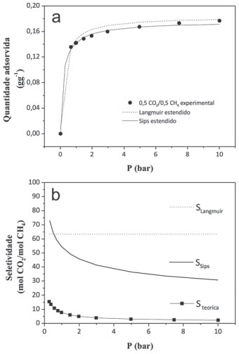 ![]() Figura 5. (a) Experimento de adsorção com mistura 50%CO2 / 50%CH4 e predições pelos modelos estendidos de Langmuir e Sips (b) Seletividade em termos de mol CO2/mol CH4 calculadas a partir das isotermas monocomponentes e dos modelos estendidos de Langmuir e Sips
