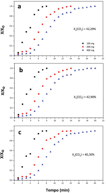 ![]() Figura 6. Medições realizadas no (a) dreno 1 (CO2 = 42,29%), (b) dreno 2 (CO2 = 42,90) e (c) dreno 3 (CO2 = 40,30%)