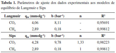 A isoterma de adsorção de CO2 apresentou forma retangular, indicando alta afinidade a baixas pressões da zeólita pelo CO2. Esta isoterma é típica de materiais zeolíticos e pode ser interessante em processos de captura de CO2. As capacidades de adsorção medidas são comparáveis aos resultados reportados na literatura.19,20 A maior capacidade de adsorção de CO2 atribui-se ao fato deste gás apresentar uma maior temperatura crítica quando comparado com CH4. O dióxido de carbono apresenta comportamento de vapor condensável nas condições estudadas, sendo assim menos volátil e facilmente adsorvido em comparação ao CH4. Os dados de equilíbrio das isotermas monocomponentes de CO2 e CH4 a 40 ºC foram ajustados aos modelos de equilíbrio de Langmuir e Sips e os parâmetros de ajuste são apresentados na Tabela 1, encontrando-se valores de R2> 0,95 para o ajuste ao modelo de Langmuir e R2> 0,98 para o modelo de Sips.