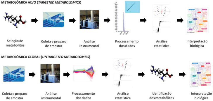 IDepartamento de Química Fundamental, Instituto de Química, Universidade de São Paulo, 05508-000 São Paulo - SP, Brasil Recebido em 12/06/2017 *e-mail: mfmtavar@iq.usp.br Metabolomics is an emerging and promising omics approach used to understand biological mechanisms. By untargeted and targeted metabolomics analyses, metabolites are determined in biological samples (fluids, cells, tissues, etc.) by comparison of control groups with altered groups, undergoing different therapies, submitted to differing stress levels, dietary modulation, or promoted by a disease, or specific condition, etc., using sophisticated analytical techniques, and advanced data treatment and statistical analyses. In this review, the concepts involved in metabolomics studies were presented, describing in details all steps involved in the metabolomics workflow, for untargeted and targeted strategies. Finally, the potential of metabolomics is illustrated by applications in representative areas: clinical, environmental, food and nutrition, forensic toxicology, microbiology, parasitology, plants, and sports. Relevant reviews were compiled to characterize each of these areas, and a corresponding application of untargeted and targeted metabolomics were described. INTRODUÇÃO As ciências ômicas buscam o entendimento do funcionamento celular dos organismos e suas alterações biológicas. Fazem parte deste conjunto de ciências, a genômica (estudo da alteração dos genes), a transcriptômica (estudo das alterações dos transcritos), a proteômica (estudo das alterações das proteínas), e a metabolômica (estudo das alterações dos metabólitos). Metabólitos são produtos intermediários ou finais do metabolismo em uma amostra biológica.1 O conjunto de todos os metabólitos de baixa massa molecular (até 1500 Da), presentes ou alterados em um sistema biológico, é chamado de metaboloma (do inglês, metabolome).2 A pesquisa relacionada a metabólitos vem sendo desenvolvida há décadas, mas em 1999, Nicholson et al. definiram a metabonômica (do inglês, metabonomics), como sendo a medida quantitativa da resposta metabólica de um sistema biológico após estímulos fisiopatológicos ou modificações genéticas.3 Já o termo metabolômica (do inglês, metabolomics) foi introduzido em 2001, por Oliver Fiehn, como sendo a análise abrangente e quantitativa do metaboloma de um sistema biológico.4 Além disso, a literatura nos apresenta outras denominações envolvendo esse campo da ciência, tais como: perfil metabólico (do inglês, metabolic profiling), descrito como sendo a análise de metabólitos previamente selecionados de rotas bioquímicas específicas,5 a impressão digital metabólica (do inglês, metabolic fingerprinting), que é definida como sendo "uma classificação de amostras de acordo com sua origem ou sua relevância biológica",3 e, por último, análise footprinting (ainda sem tradução para o português), para se referir aos metabólitos excretados por uma célula em condições controladas.6 Observa-se, portanto, uma divergência em relação às terminologias aplicadas às análises metabolômicas/metabonômicas, mas o que estas definições possuem em comum é que a resposta medida a nível molecular é obtida a partir de uma visão integrada da bioquímica em organismos complexos.7 Assim sendo, será adotado neste trabalho de revisão duas abordagens para classificar as análises metabolômicas: metabolômica alvo (do inglês, targeted metabolomics), definida como a análise quantitativa de um ou mais metabólitos pré-selecionados de determinada classe química, ou que estejam associados a rotas metabólicas específicas, e metabolômica global (do inglês, untargeted metabolomics), que está baseada na análise qualitativa do maior número de metabólitos possível, pertencentes a diversas classes químicas, contidas no sistema biológico em estudo. Cabe ressaltar que essas abordagens sempre se referem a medidas comparativas entre grupos de amostras. A comparação do metaboloma de um grupo sujeito a alterações ambientais ou genéticas, alimentares, de tratamento terapêutico, etc. (grupo teste), com um grupo de indivíduos não alterados (grupo controle) pode fornecer informações importantes no que diz respeito ao entendimento do fenótipo de um organismo, desempenhando um papel fundamental na biologia de sistemas.8 A metabolômica vem sendo aplicada em diferentes áreas do conhecimento, como análises clínicas, alimentos e nutrição, esportes, ambiental, toxicologia forense, ou análise de organismos patológicos (parasitas, bactérias, fungos), entre outras. Uma revisão detalhada de todas as definições e o fluxograma de trabalho das análises metabolômicas global e alvo foram apresentados em um capítulo de livro, recentemente publicado pelo grupo de pesquisa.9 O intuito deste artigo de revisão é apresentar em linhas gerais o fluxograma de trabalho da metabolômica, com ênfase em algumas particularidades e, por fim, destacar artigos de revisão e aplicações em análises global e alvo das grandes áreas estudadas sob o ponto de vista da metabolômica. Fluxograma de Trabalho Para se desenvolver estudos metabolômicos, global e alvo, recomenda-se seguir uma série de etapas, que estão apresentadas resumidamente na Figura 1, e que serão discutidas com mais detalhes nas próximas seções.