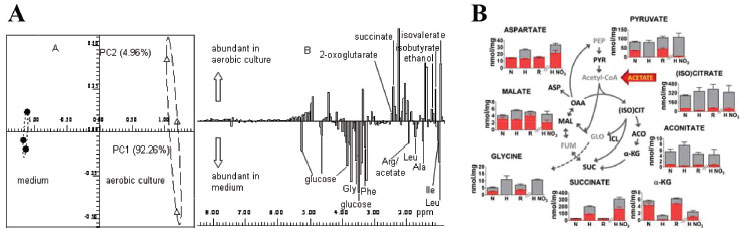 Figura 6. Exemplos de estudo em metabolômica em microbiologia. A) Gráfico de scores e loading de modelo PCA dos metabólitos responsáveis pela discriminação das condições de crescimento de S. aureus, grupos aeróbico e anaeróbico. Reproduzido da referência 196 com permissão da NRC Research Press. B) Remodelamento associado à hipóxia da atividade do ciclo TCA de Mycobacterium tuberculosis. Altura das barras indica a concentração do metabólito e a coloração, a extensão da marcação isotópica proveniente do acetato. Reproduzido da referência 197 com permissão da PNAS