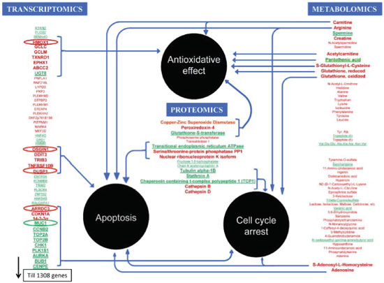 Figura 5. Exemplo de estudo em foodomics. Metabólitos, proteínas e genes envolvidos na ação de extratos de alecrim em células de câncer de cólon. Reproduzido da referência 168 com permissão da Elsevier