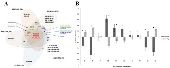 Figura 7. Exemplos de estudo em metabolômica em parasitologia. A) Diagrama de Venn dos 142 metabólitos identificados por RPLC-MS (modos positivo e negativo), HILIC-MS (modos positivo e negativo) e CE-MS (modo positivo). Metabólitos coloridos de acordo com o número de técnicas de análise em comum. Reproduzido da referência 228 com permissão da ACS. B) Comparação das áreas normalizadas de metabólitos discriminantes entre grupos de cães saudáveis e infectados com L. infantum. Metabólitos marcados com asterisco apresentam alta significância estatística (p-valor < 0,05) e são considerados biomarcadores. Reproduzido da referência 229 com permissão da Springer