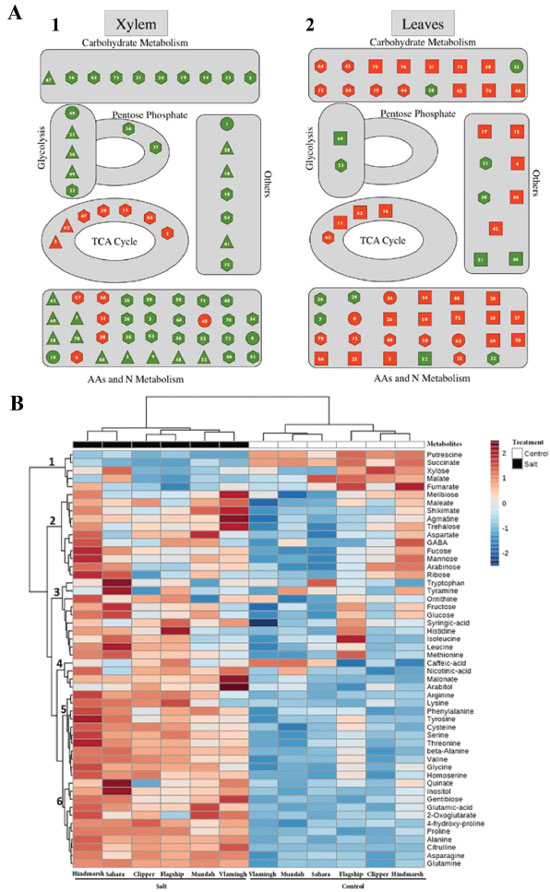 Figura 8. Exemplos de estudo em metabolômica de plantas. A) Alterações nas rotas metabólicas afetadas pela deficiência de ferro em cultivos de tomate, beterraba, tremoço e pessegueiro em 1) amostras de caule e 2) extratos de folhas. Símbolos em verde significam diminuídos e em vermelho aumentados. Legenda: (⬢) refere-se a amostras de tomate, (▲) tremoço, (■) beterraba e (●) pessegueiro. Reproduzido da referência 256 com permissão da Frontiers. B) Heatmap dos metabólitos detectados em seis variedades de raízes de cevada, sob interferência de estresse salino e suas alterações. Reproduzido da referência 257 com permissão da Frontiers