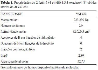 RESULTADOS E DISCUSSÃO A proposta apresentada visa contextualizar aulas de disciplinas de cursos de graduação que tratem do desenvolvimento de NEQ, tais como: Química Farmacêutica; Química Medicinal; Síntese de Fármacos e outras, buscando trazer para a realidade das salas de aula tópicos que são relevantes para a P&D da indústria farmacêutica. A sequência didática é composta por atividades práticas computacionais e experimentais, em que inicialmente os estudantes serão apresentados à RO5 e, utilizando o ChemSpider®, irão conhecer uma maneira de verificar se determinada molécula viola ou não essa regra. As etapas experimentais de laboratório tratam-se da síntese de um composto heterocíclico 1,3,4-oxadiazol, uma estrutura relativamente complexa, empregando métodos sintéticos simples, de baixo custo e altos rendimentos, características almejadas pela indústria farmacêutica. O ChemSpider® é uma base de dados de acesso livre que pertence à Royal Society of Chemistry, e fornece variadas informações de mais de 58 milhões de substâncias químicas a partir de aproximadamente 500 fontes de dados.40 Esta ferramenta permite a busca por um termo, que pode ser o nome de compostos de interesse, sinônimos, número de registro da substância (CAS) ou outros. O que torna a plataforma ainda mais interessante é que a pesquisa também pode ser realizada através da busca pela estrutura química da substância que está em estudo. Dentre as informações fornecidas pela base de dados, como resultado de busca, estão as estimativas das propriedades físico-químicas realizadas com o ACD/Labs, EPISuite, ChemAxon e Mcule. Nesta atividade didática foram utilizados os dados gerados pelo ACD/Labs, pois é realizada gratuitamente e sem necessidade de cadastro prévio. Diante do exposto, a primeira aula prática foi ministrada no laboratório de informática da instituição e os estudantes foram orientados a acessar o ChemSpider® através do endereço: http://www.chemspider.com/ . E em seguida, clicar no link Structure, para abrir uma página que permite desenhar estruturas químicas moleculares. A estrutura do 2-fenil-5-(4-piridil)-1,3,4-oxadiazol (4) foi desenhada e a busca realizada através do link Search. Neste momento foi visualizada a estrutura com seu nome e sinônimos, os alunos foram orientados a abrir a aba Properties e, em seguida, Predicted Advanced Chemistry Development (ACD/Labs). Um quadro com as propriedades do composto heterocíclico foi gerado e as de interesse que estavam relacionadas com a RO5 de Lipinski foram avaliadas. Foi observado dentre os parâmetros analisados que a regra dos cinco não foi violada em #Rule of 5 Violations. Em seguida, o professor foi indicando cada propriedade obtida com os parâmetros da RO5, explicando que a não violação destes é relevante para a farmacocinética de moléculas com atividade biológica promissora, Tabela 1.