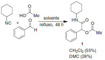 ![]() Esquema 1. Reação de Passerini modelo efetuada em CH2Cl2 e DMC como solventes