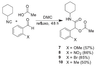 Encorajados pelos rendimentos comparáveis das reações efetuadas em refluxo de CH2Cl2 e DMC, estendemos o estudo para uma série de benzaldeídos orto-substituídos, os quais foram refluxados com cicloexilisonitrila e ácido acético em DMC por 48 horas, fornecendo as respectivas α-acetiloxi-N-cicloexilamidas 7-10 em rendimentos que variaram de bons a excelentes (Esquema 2).