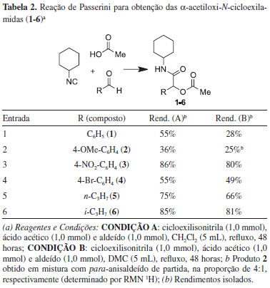 Em seguida, variamos o componente aldeído da reação de Passerini, utilizando benzaldeídos para-substituídos com diferentes grupos doadores e retiradores de elétrons, assim como aldeídos alifáticos (Tabela 2). Como esperado, aldeídos mais reativos, tais como o para-nitrobenzaldeído e os butiraldeídos, levaram às α-acetiloxi-N-cicloexilamidas desejadas em rendimentos maiores, em ambos os solventes. Por exemplo, a reação do para-nitrobenzaldeído nas condições estudadas levou a 3 em 86% e 80% de rendimento quando a reação foi efetuada em CH2Cl2 e DMC, respectivamente (entrada 3). Já quando o para-anisaldeído foi utilizado como material de partida, o composto 2 foi obtido em rendimentos baixos, 36% para CH2Cl2 e 25% para DMC (entrada 2).
