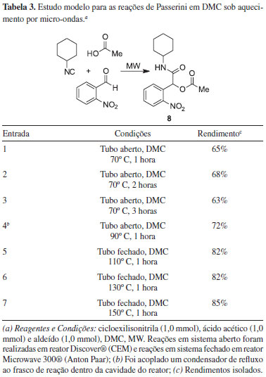 Também investigamos o uso da radiação de micro-ondas como fonte alternativa de aquecimento para as reações de Passerini estudadas. Em 2011, Barreto e colaboradores prepararam uma série de α-acilóxi carboxamidas através da Reação de Passerini sem solvente aquecida por irradiação de micro-ondas.25 Mais recetemente, Ingold e colaboradores descreveram a síntese de análogos furoxânicos do tocferol empregando reações de Passerini em condições sustentáveis.26 Tomamos como modelo a reação entre o orto-nitrobenzaldeído, cicloexilisonitrila e ácido acético em DMC, utilizando diferentes temperaturas e tempos reacionais, em tubo aberto (com dispositivo de refluxo do solvente, quando necessário) e em tubo fechado. Os resultados estão sumarizados na Tabela 3. Quando as reações foram feitas em tudo aberto sob refluxo de DMC por 1 hora (reator Discover®, CEM), a α-acetiloxi-N-cicloexilamida 8 foi obtida em rendimentos ligeriamente inferiores àqueles obtidos em refluxo de DMC sob aquecimento convencional (entradas 1-4). É importante ressaltar que nos casos onde não se observou conversão completa dos materiais de partida, também não houve isolamento de subprodutos reacionais, e que tempos de reação maiores que os especificados na Tabela 3 não resultaram em incremento do rendimento da reação. Entretanto, quando a mesma reação foi efetuada em sistema fechado (Microwave 300®, Anton Paar), o que permitiu trabalhar em temperaturas acima do ponto de ebulição do DMC, o composto 8 foi isolado em 82% e 85% de rendimento após 1 hora de reação a 130 ºC (entradas 6) e a 150 ºC (entrada 7), respectivamente.