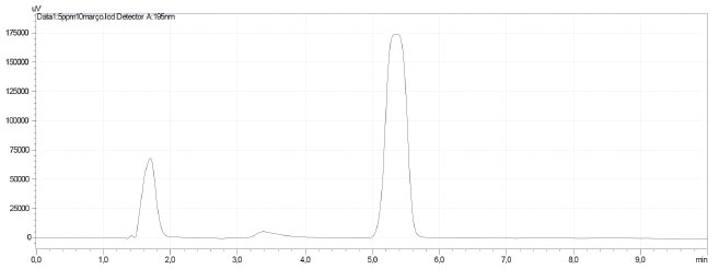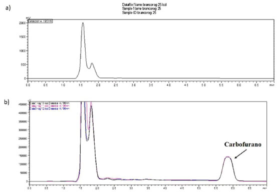 ![]() Figura 3. (a) Cromatograma de um extrato obtido de abobrinha isenta dos princípios ativos e (b) Cromatograma de extratos de abobrinha contendo o carbofurano a 5,0 mg L -1.