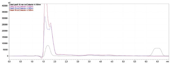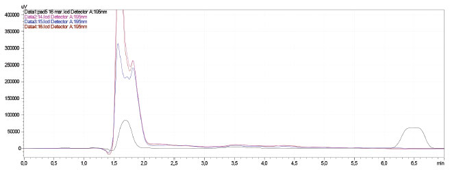 Figura 4. Cromatograma de extratos obtidos de matrizes reais de abobrinha (amostra 1) (—) (—) (—) replicatas comparadas ao padrao do carbofurano 5,0 mg L -1 (—)