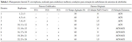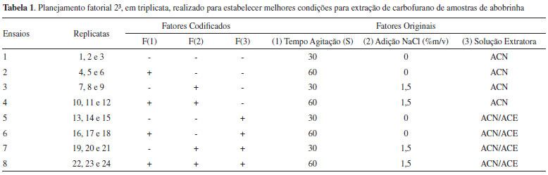 PARTE EXPERIMENTAL A otimizaçao do ensaio experimental consistiu na utilizaçao da técnica ESL-PBT, seguida de análise por HPLC-UV conforme metodologia proposta por Goulart et al.21 Reagentes e soluçoes Os reagentes e solventes utilizados foram acetato de etila (99,5% v/v - Mallinckrodt/HPLC) e acetonitrila (99,5% v/v - J.T. Baker/HPLC) e cloreto de sódio (99,5% m/m - Synth). A soluçao padrao estoque na concentraçao de 100,0 mg L -1 de carbofurano (99,9% m/m - Sigma Aldrich) foi preparada em acetonitrila e armazenada em freezer. A partir de diluiçao da soluçao estoque, foi preparada uma soluçao padrao de trabalho contendo o carbofurano na concentraçao de 5,0 mg L -1. Obtençao de amostras Para a otimizaçao da técnica de extraçao sólido-líquido com partiçao em baixa temperatura (ESL/PBT) e análise por HPLC-UV foram utilizadas abobrinhas cultivadas sem adiçao de agrotóxicos (Branco) na zona rural do município de Itumbiara-GO, Brasil. Após coleta, as amostras de abobrinha foram refrigeradas e analisadas no Laboratório de Análise Química Instrumental do Instituto Federal de Goiás - Campus Itumbiara (IFG - Itumbiara), onde foram preparadas. Otimizaçao da técnica ESL/PBT Amostras de abobrinhas isentas de agrotóxicos foram picadas e trituradas em mixer até total homogeneizaçao. Em seguida, 1,0000 g de polpa da amostra foram colocadas em frascos de vidro transparente (22 mL) e fortificadas com 2 µL de soluçao-padrao de carbofurano a 5,0 mg L -1 e homogeneizadas. As amostras fortificadas (na presença e ausência de adiçao de sal) foram acrescentadas água (2 mL) e solventes extrator na proporçao (1:2). O sistema foi agitado em vórtex e as amostras foram levadas ao freezer a -20 ºC por no mínimo 3 horas para separaçao das fases. Após este intervalo, foi retirado 1 mL da fase orgânica e colocado em vial para análise cromatográfica. Para a otimizaçao do método foi empregado um planejamento fatorial completo, 23, para avaliaçao do comportamento simultâneo de três fatores: tempo de agitaçao em vórtex (30 ou 60 s), adiçao de sal (sem ou com 1,5% (m/m) de NaCl) e solvente extrator (acetonitrila- ACN ou acetonitrila:acetato de etila - ACN/ACE 81,25:18,75). Os três fatores foram analisados em dois níveis e as análises foram realizadas em triplicatas. As melhores condiçoes do planejamento foram avaliadas em funçao das porcentagens de extraçao obtidas em cada ensaio. A precisao do método otimizado foi determinada por meio do coeficiente de variaçao (CV) para nove extraçoes idênticas de brancos fortificados a 5 mg L -1. Esses dados foram tratados empregando o programa Excel r. Os dados do planejamento sao apresentados na Tabela 1.