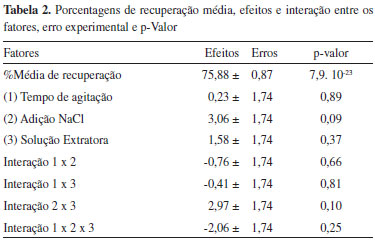 Otimizaçao da técnica ESL/PBT No processo de otimizaçao do método foi empregado um planejamento fatorial completo, 23, para avaliaçao do comportamento simultâneo de três fatores: tempo de agitaçao em vórtex (30 ou 60 s), adiçao de sal (sem ou com 1,5% (m/m) de NaCl) e solvente extrator (acetonitrila- ACN ou acetonitrila:acetato de etila - ACN/ACE 81,25:18,75). Os resultados das combinaçoes dos fatores foram registrados para análise e interpretaçao em planilhas eletrônicas, conforme Teófilo e Ferreira.25 A escolha das melhores condiçoes para aplicaçao da técnica ESL/PBT favorece melhores resultados, levando a maior frequência analítica (agilidade nas análises por unidade de tempo) e menor custo. Os resultados da análise estatística sao apresentados na Tabela 2.