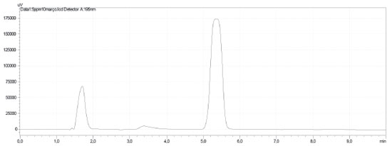 Para verificaçao da significância dos dados apresentados na Tabela 2, foi aplicado o teste t de t-student ao nível de 95% de confiança e 5% significância. Para 8 graus de liberdade com 95% de probabilidade o valor t correspondente é 2,306, dessa forma serao significativos os fatores com valores excedentes a (0 + 2,306 x 1,74) = 4,01, análogo a dizer que serao significativos todos os efeitos cujo valor de p < 0,05.25 Verifica-se na Tabela 2 que estatisticamente, nos níveis estabelecidos, os fatores nao sao significativos ao ponto de interferir no aumento ou diminuiçao das porcentagens de recuperaçao do carbofurano na matriz abobrinha. Entretanto, a fim de selecionar o melhor ensaio para determinaçao e quantificaçao de carbofurano na matriz investigada, é de fundamental importância entender a atuaçao de cada fator no processo. Observando-se o processo de agitaçao das amostras, foi verificado que elevando o tempo de agitaçao de 30 s para 60 s, o percentual de recuperaçao aumentou em média 0,235%. Esta etapa é de fundamental importância no processo analítico por representar o momento de maior interaçao entre o solvente extrator e o analito, proporcionando melhor precisao, praticidade, frequência analítica e alto rendimento.26 Por esse motivo foi escolhido o tempo de agitaçao de 60 s. A adiçao de NaCl ao sistema foi o fator que mais influenciou no aumento das porcentagens de recuperaçao. Com o aumento da força iônica do sistema, observou-se um aumento de 3,06% na eficiência da extraçao. Geralmente, a introduçao de sais, como NaCl, à fase aquosa do sistema permite obter maiores percentuais de recuperaçao para compostos orgânicos, pois diminui a solubilidade destes na fase aquosa, favorecendo a transferência destes para a fase orgânica.26 Com relaçao à soluçao extratora, observou-se que nos ensaios utilizando apenas acetonitrila como solvente extrator, a recuperaçao média foi de 73,1%, enquanto que, empregando a mistura acetonitrila: acetato de etila (81,25: 18,75) obteve-se média de recuperaçao de 76,7%. A recuperaçao média de todos os ensaios foi 75,88%. A precisao do método foi determinada através do coeficiente de variaçao (CV) para nove extraçoes idênticas de brancos fortificados a 5 mg L -1 e os resultados foram 73,7% com coeficiente de variaçao de 5,3%. Resultados semelhantes foram obtidos na determinaçao de agrotóxicos em tomates realizada por Pinho et al.20 quando empregaram a combinaçao de dois solventes. A mesma técnica foi aplicada por Costa et al.11 para determinaçao de agrotóxicos em amostras de alface, obtendo percentuais de recuperaçao entre 72,3% e 103,2%. Atualmente a técnica ESL/PBT foi aplicada na análise de bifenilas policloradas em lodo de esgoto e os percentuais de extraçao foram superiores a 82%.27 Além da eficiência de extraçao e compatibilidade com a técnica cromatográfica, outros fatores devem ser avaliados para escolha do melhor solvente extrator, entre eles a viabilidade econômica e o descarte dos resíduos dos solventes orgânicos. Como as médias de recuperaçao estatisticamente nao diferem entre si, considerando que a acetonitrila é miscível em água e apresenta baixo ponto de fusao (-45 °C), propriedades essenciais para se empregar a ESL/PBT, este foi o solvente extrator escolhido.28 Assim, o ensaio 4 (repetiçoes 10, 11 e 12) com tempo de agitaçao em vortex - 60 s; adiçao de NaCl e ACN como solvente extrator foram escolhidos para dar continuidade ao trabalho, em virtude da viabilidade prática e econômica do experimento. Na Figura 3 está apresentado um cromatograma de um extrato do branco da abobrinha e cromatogramas obtidos de amostras de abobrinha livres de carbofurano, fortificadas e submetidas ao Ensaio 4. Observa-se que o tempo de retençao do carbofurano está entre 5 e 6 minutos. O extrato do branco nao apresenta picos no tempo de retençao dos carbofurano, o que permite afirmar que o método proposto apresenta seletividade.29