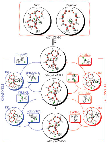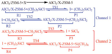 RESULTS AND DISCUSSION We first demonstrate our calculation results for the reaction mechanism of disproportionating methyltrichlorosilane and trimethylchlorosilane, which are catalyzed by 24T cluster AlCl3/X-ZSM-5 (X stands for pre- and post-modified by (AlCl2)+, and (BCl2)+). The reaction formula is shown in Figure 1, and is divided into two channels. The first step of the disproportionate reaction is the forming process of the intermediate and dichlorodimethylsilane via transition state TS1 in channel 1. In order to make the disproportionation proceed smoothly, the four key atoms (Cl3-Si2 and C2-Al4 are close to each other, Si2-C1 and Al1-Cl4 are slightly away from) form the transitional state TS1 which is a four-membered ring structure. The bonds of four-membered ring structure are not fully formed and not completely broken. This is consistent with the results of the previous configuration.19 The transition states in the subsequent steps also have the similar four-membered ring structure.18 Next, the intermediate reacts with methyltrichlorosilane via transition state TS2. The catalyst and dichlorodimethylsilane are received by this reaction. This process is the main reaction, and is the main channel of the reaction. In channel 2, the intermediate and by-product of silicon tetrachloride are gained through methyltrichlorosilane and catalyst reaction. The catalyst and by-product (silicon tetrachloride) are then received through trimethylchlorosilane and intermediate reaction. This process is the side reaction. The formulas of the two channels are shown in Figure 1, and the whole process is shown in Figure 2.
