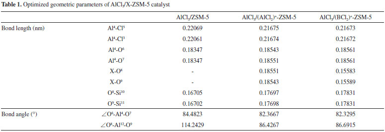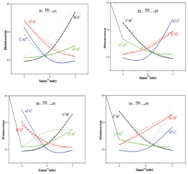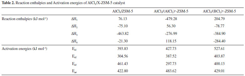 The transition states are tracked during calculation in Forward and Reverse using the IRC method. We take TS1 as an example, the Cl3 atom moves to the Si2 atom, and bonds with it when the catalyst takes part in the reaction. Meanwhile, the Si2-C1 bond and Al1-Cl4 bond are broken. The C2 and Al4 atoms gradually move close to each other, and bond to produce product P1 at the same time. Finally, the corresponding products are generated from reactants via TS1, which confirms the accuracy of the reaction path. The spacing traces of the key atoms along the IRC are calculated, as shown in Figure 3. The results show that the key atoms along the IRC path have the tendency to bond or break, and move towards their respective reactants or products, which proves that the mechanism is valid. Thus, it is proved that the reaction process (shown in Figure 1 and Figure 2) is reasonable. The energy is calculated by using second-order Moller-Plesset perturbation theory (at MP2/6-311++G (3df, 2pd) level) and the Zero Point Energy (ZPE) correction is considered. The reaction enthalpies (ΔH) and activation energies (Ea) are given in Table 2. The activation energies of AlCl3/X-ZSM-5 reaction system are shown in Figure 5. The activation energy of the rate-determining step in the main reaction is: 393.83, 427.73, and 527.61 kJ mol-1, respectively. The activation energy of the rate determining step of side reaction is: 461.43, 483.62, and 429.01 kJ mol-1, respectively. With regard to Cat. I and Cat. II, the activation energy of RDS in channel 1 is lower than channel 2, indicating that channel 1 is the main reaction. For Cat. III, although the activation energy of RDS in channel 2 is lower than channel 1, its numerical value is large. So the reaction is not easy to occur. It is further explained that the unmodified catalyst is effective. The activation energy of the main reaction for Cat. I (393.83 kJ mol-1) is lower than that of Cat. II (427.73 kJ mol-1) and Cat. III (527.61 kJ mol-1). The order of the activation energy is: Cat. I > Cat. II > Cat. III. Comparing with the 5T cluster AlCl3/ZSM-5 (93 kJ mol-1),18 it is shown that 5T cluster is better. This indicates that the main activity of the disproportionation reaction is on the surface of the catalyst. But, the 24T catalytic system effect is not so ideal, and the catalytic effect of the unmodified catalyst is slightly better. The bond of Cat. I is easier to form, so the reaction is easier to occur. The catalyst of AlCl3/ZSM-5 modified by (AlCl2)+, and (BCl2)+ is ineffective, and the catalytic activity is obviously reduced. The reason may be that the electron cloud density of acid site (-AlCl2) is reduced when modified by (AlCl2)+, and (BCl2)+. The electron clouds of acid sites on Cat. II and Cat. III transfer to other parts, resulting in significant reduction in the activity of the modified catalyst. The results of the energy analysis are consistent with the results of the previous catalyst structure analysis (Table 1).