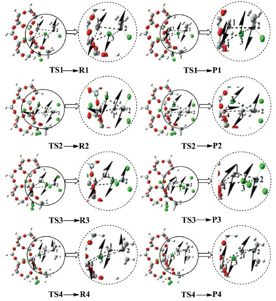 ![]() Figure 2. Molecular structures, key atomic number, reaction process, and the virtual vibration mode of transition states