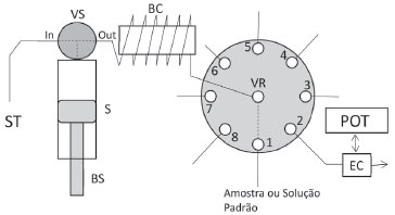 PARTE EXPERIMENTAL Aparelhos e reagentes As soluções de ácido clorídrico utilizadas como eletrólito suporte ou solução transportadora foram preparadas com reagente de alta pureza, Surprapur® da Merck (Rio de Janeiro, Brasil). Todos os outros reagentes foram de grau analítico, sendo usados sem purificação adicional. As soluções foram preparadas com água desionizada até resistividade > 18 MΩ cm em um sistema Simplicity 185 da Millipore (Billerica, MA, EUA). A manipulação das soluções foi feita por meio de um sistema de injeção sequencial montado no laboratório, esquematizado na Figura 1. As soluções foram conduzidas por uma bomba de seringa (BS) Cavro, SP (Cavro Scientific Instruments, Sunnyvale, CA) com capacidade de 5,0 mL e uma válvula rotatória (VR) de 8 portas (Valco Instrument Co., Houston, TX). A bomba de seringa e a válvula rotatória foram conectadas através de uma válvula de três vias, VS (posições in e out), pela bobina coletora, BC, feita com tubo de Teflon® de 3 m de comprimento com 1,0 mm de diâmetro interno e, portanto, 2,36 mL de volume interno. O volume interno deve ser desta magnitude para evitar a contaminação da solução transportadora no interior da seringa com a solução da amostra. Conexões das portas da válvula rotatória com as soluções e a célula de detecção foram feitas com tubos de Teflon com diâmetro interno de 0,5 mm e conexões de Teflon (Upchurch, Oak Harbor, WA). Os controles da bomba e da válvula foram efetuados com o software FIAlab 5.0.