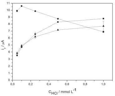![]() Figura 2. Efeito da concentração de HCl como ES nas correntes de pico, ip, para uma solução de As(III) 1,0 µmol L-1. STR e SA: (■) ambas em HCl 0,050 mol L-1, (▲) 0,050 e 1,0 mol L-1, respectivamente e (●) ambas em HCl 1,0 mol L-1. Volume de amostra = 1500 µL; vazão=15 µL s-1; frequência de pulsos = 100 Hz