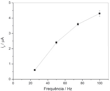 ![]() Figura 3. Variação da corrente de pico (ip) para diferentes frequências de pulsos de onda quadrada para medidas de uma solução de As(III) 1,0µmolL-1,sob as condições: vazão = 15 µL s-1; volume de solução As(III) = 1000 µL