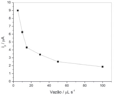O efeito da vazão foi estudado numa faixa entre 5 e 100 µL s-1, com volume de amostra (1000 µL) e frequência de pulsos (100 Hz) fixos (Figura 4). O aumento da vazão de 5 a 100 µL s-1 diminuiu em cerca de 80% o valor de ip. Com isso, concluiu-se que o aumento da eficiência do transporte de massa em alta vazão não compensou a diminuição do tempo de deposição para um mesmo volume de amostra.