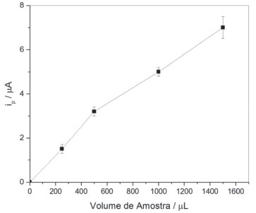 Quanto maior o volume de amostra usado, maior foi o tempo de deposição necessário para que este passasse pela célula de fluxo durante a etapa de deposição. De modo similar, maiores volumes de amostra demandam mais tempo de aspiração para a bobina coletora, mantida a mesma vazão em todos os experimentos. Com isso, o tempo de condicionamento também foi variado nesse caso para garantir que o potencial de deposição fosse aplicado durante todo o período de passagem da zona de amostra pelo detector. Maiores volumes de amostra geraram maiores valores de ip, de modo consistente com os resultados de Punrat et al.14 e Laschi et al.,18 sendo que o sinal aumentou cerca de 5 vezes com o aumento de volume de 250 para 1500 µL (Figura 5).
