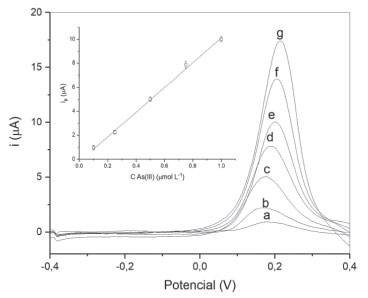 ![]() Figura 6. Voltamogramas (subtraídos do branco) obtidos para soluções (a) 0,10, (b) 0,25, (c) 0,50, (d) 0,75, (e) 1,0, (f) 2,5 e (g) 5,0 µmol L-1 de As(III), que resultaram na curva analítica, ip = (10,3±0,2)CAs(III) - (0,2±0,1), obtida em condições de vazão e volume de amostra de 15 µL s-1 e 1500 µL, respectivamente. Frequência de pulsos = 100 Hz. Eletrólito suporte e branco: HCl 0,50 mol L-1
