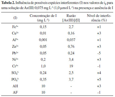 Os limites de detecção (LOD) e quantificação (LOQ) foram calculados em função do desvio padrão das 10 medidas do branco (HCl 0,50 mol L-1) para um intervalo de confiança de 95%, conforme as equações 1 e 2: ![]() em que σB é o desvio padrão do branco e m é o coeficiente angular da curva analítica. Os valores de LOD e LOQ foram 0,02 e 0,07 µmol L-1 (ou 1,5 e 5,2 µg L-1), respectivamente. O limite de quantificação foi cerca de 2 vezes menor que a concentração permitida pela organização mundial de saúde (OMS) para As(III) em água potável (10 µg L-1). O limite de detecção foi menor do que o obtido por Laschi et al.,18 de 2,5 µg L-1, usando o método SWASV em modo estático com tempo de deposição de 60 s, volume de amostra de 2 mL e sensores impressos de ouro. A maior detectabilidade do método aqui proposto pode ser explicada pela melhor eficiência no transporte de massa obtida nas condições de fluxo usadas na etapa de deposição de Asº. Comparado com outros métodos em fluxo, o LOD do método aqui proposto é menor do que aqueles obtidos por métodos amperométricos indiretos baseados na reação de As(III) com I2 gerado eletroquimicamente no eletrodo impresso disco-anel (4.0 µmol L-1)15 ou na reação de arsina com I2 (5.0 µmol L-1).16 No método descrito por Punrat e colaboradores,14 o LOD é significativamente menor (0,03 µg L-1), o que pode ser explicado pela forma de preparo do eletrodo de trabalho por eletrodeposição a partir de uma solução de Au(III) sobre um sensor impresso de grafite. Nesse caso, imagens de microscopia eletrônica de varredura mostraram que o depósito não é de um filme uniforme, mas sim de partículas com diâmetro médio de 570 ± 83 nm, conferindo uma área efetiva de eletrodo significativamente maior do que a do eletrodo cristalino polido. Por outro lado, como mencionado anteriormente, o método aqui proposto permite monitorar as concentrações de As nos níveis estabelecidos pela OMS, usando condições de trabalho mais simples, sem a necessidade de realizar a eletrodeposição de Au a partir de soluções de Au(III), que apresentam alto custo. Uma possível explicação para isso é uso da voltametria de onda quadrada, na qual a discriminação da corrente faradaica em relação à capacitiva é muito mais eficiente do que na varredura linear usada por Punrat e colaboradores. A precisão foi avaliada por estudos de repetitividade das correntes de pico obtidos para soluções de As(III) nos níveis de concentração de 0,25, 0,50 e 0,75 µmol L-1, em triplicata. Os respectivos desvios padrão relativos para as medidas dessas soluções foram 7,9, 2,8 e 0,7%. Interferências Foram avaliadas as possíveis interferências da presença de outras espécies iônicas nos valores de ip de uma solução de As(III) 1,0 µmol L-1 na ausência e presença das espécies potencialmente interferentes (Tabela 2).