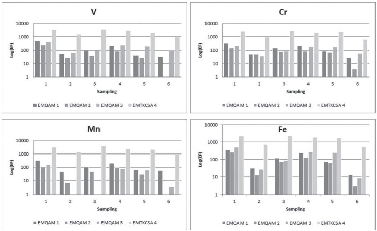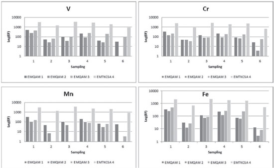 RESULTS AND DISCUSSION The results obtained for the samples from the four monitoring stations and the control station (PUC-Rio) are presented in Tables 4S-9S of the Supplementary Material, and the calculated enrichment factors are shown in Tables 10S-15S, where the bold values represent those higher than 100. Taking the values obtained for EMTKCSA 4, the meteorological station sampling point installed inside steelwork and close to its slag deposition area, as a reference, the elements V, Cr, Mn and Fe were those which systematically showed the highest enrichment factors. Figure 3 shows the variations in the enrichment factor (EF) values obtained for these four elements during the six sampling periods. Considering the distance from the steelwork and the main wind direction (Figure 1), the expected sequence in terms of EF to the stations located outside the steelwork complex should be EMQAM 1> EMQAM 2> EMQAM 3. In general, only points 1 and 3 presented EF (%) greater than 100, and the observed sequence, EMQAM 3> EMQAM 1> EMQAM 2, did not follow the expected one, indicating that for the stations located outside the steelwork complex others sources must be taken into account as vehicular traffic and soil resuspension.