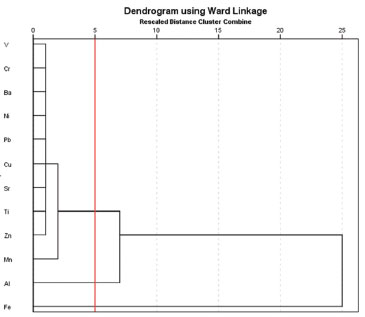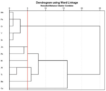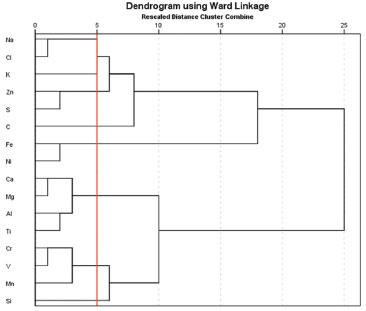![]() Figure 6. Dendrogram representing the grouping of elements based on the results of dust collectors installed inside the steelwork complex