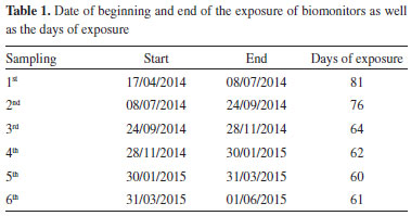 From each composite sample, three (3) aliquots of 0.5 gram were weighed out, with a total of nine (9) aliquots per monitoring point. These aliquots were treated with 5 mL sub-distilled concentrated nitric acid for a period of 24 hours at room temperature and further heated at 80 ºC during 3 hours. After cooling, it was added 0.5 mL H2O2 30% (pro analysis Merck) and heated during 1 hour. The residue was removed by centrifugation and added water quality Milli-Q® up to a final volume of 20 mL. The trace elements determination was carried out using Inductively Coupled Plasma Mass Spectrometry (ICP-MS) Agilent, model 7500ce, equipped with an octopole reaction system (ORS), a low-flow nebulizer (MicroMist) connected to a quartz nebulizer chamber (Scott) mounted on a Peltier block, which was kept at 2 ºC, and a quartz torch with a 2.5 mm diameter injector. Nickel sampler and skimmer cones were utilized. For those elements presented at higher concentration, as Al and Fe, it was applied a 1:1000 dilution, whereas for those elements presented at lower concentration, as V and Cr, the dilution factor applied was 1:100. Additional operational conditions are given in Table 2S. The result for each monitoring point and exposure period was calculated based on the median of the nine aliquots for that monitoring point. Aliquots of certified reference materials Peach Leaves (NIST SRM 1547) and Tomato Leaves (NIST SRM 1573a) were simultaneously analyzed and are presented on Table 3S, in general, recoveries above 90% were obtained. However, for iron, in particular, the recovery was 75% but, as it was quite constant, it should have no effect for source apportionment purposes. With the results obtained after each exposure period, the Enrichment Factor (EF) was calculated for each monitoring point and for each element. For this study, we considered enrichment factors with values above 100 as significant, meaning a concentration twice that of the control point. The enrichment factor was obtained using the following formula. ![]() where: EFE = Enrichment Factor of the Element (E); CEA = Concentration of the Element (E) in the sample; CEC = Concentration of the Element (E) in the control sample The results of the elemental analyses of approximately 80 monthly samples of dust collected with deposition jars installed inside the steelwork complex were obtained directly from the company and were used to obtain a comparison with the biomonitoring results. The correlation between the elemental and sampling sites was tested using cluster analysis. Figure 1S shows the daily precipitation and sampling periods (red bars), it can be observed that rainfall occurred in all the sampling periods.