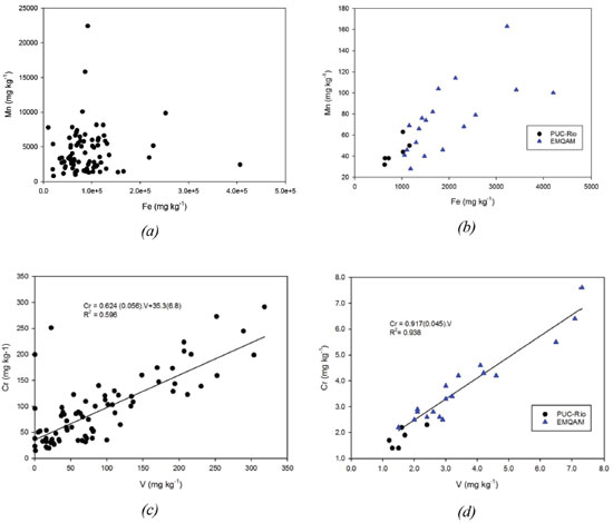 The difference between the correlations for the biomonitoring samples and dust collectors can be seen in Figures 8 a-d, showing the Fe-Mn and Cr-V plots for these two types of samples. A different behavior for Fe-Mn in the dust samples collected inside the steelwork complex area and the biomonitors can be seen that contrasts to the behavior observed for V-Cr. Iron and manganese, which represent more localized sources, such as soil resuspension and the ore stock piles inside the plant, did not present a general trend, indicating the existence of more than one source, while V-Cr, related to vehicular traffic, had one common source for dust collectors and biomonitoring samples and also for all sampling stations.